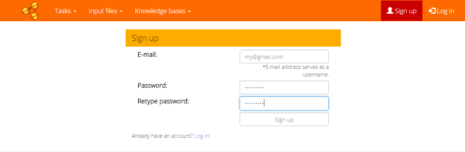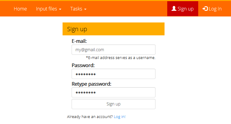 Sign up page can be opened from the main menu - item Sign up on the right side. You must fill your valid e-mail address, which serves as a username, and password (at least 8 characters).